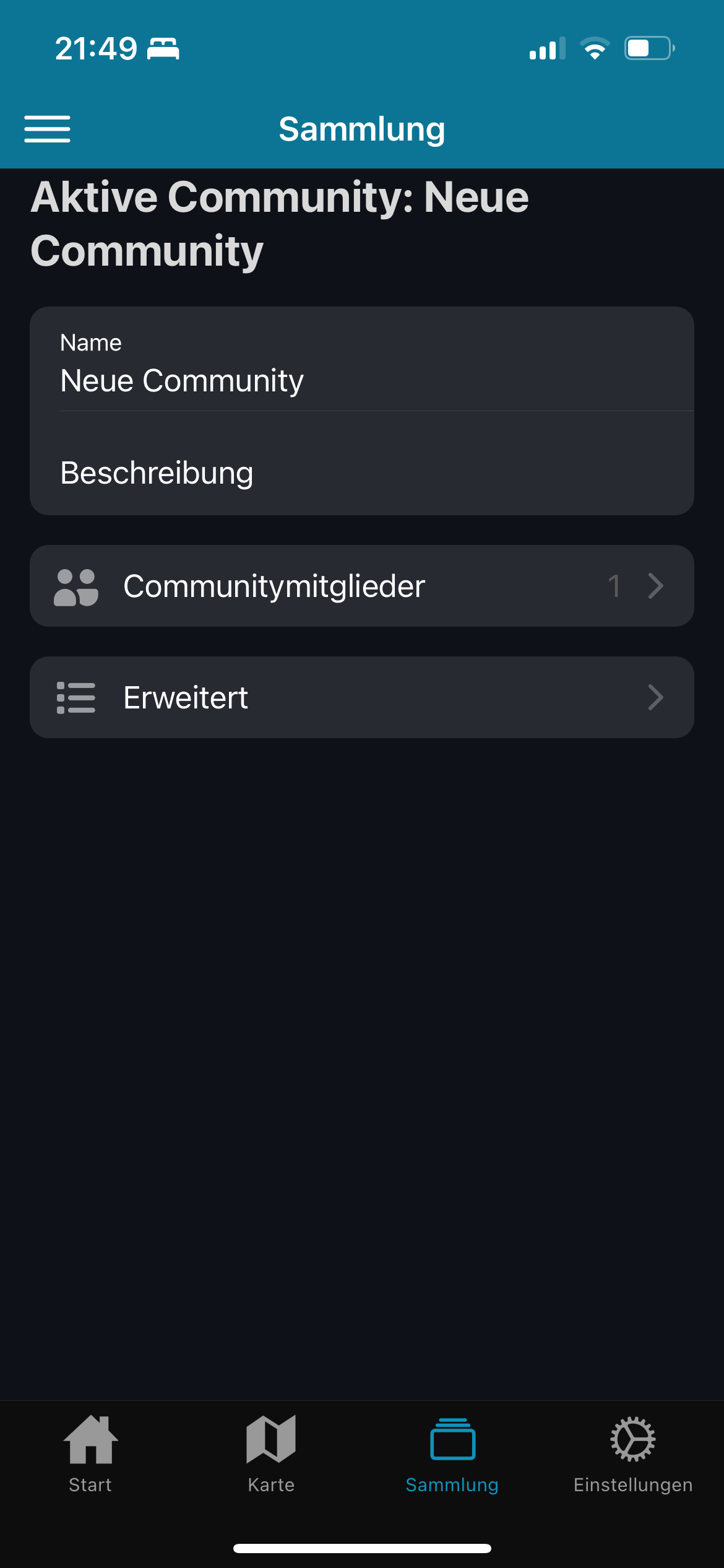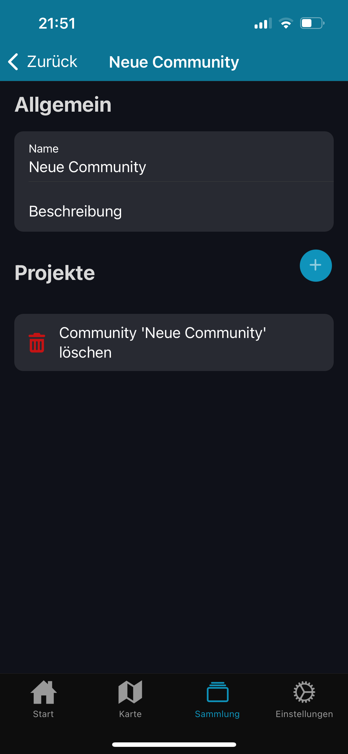 Tippen Sie auf “Neue Community erstellen”. Sogleich taucht in der Liste ein neuer Eintrag “Neue Community auf”.