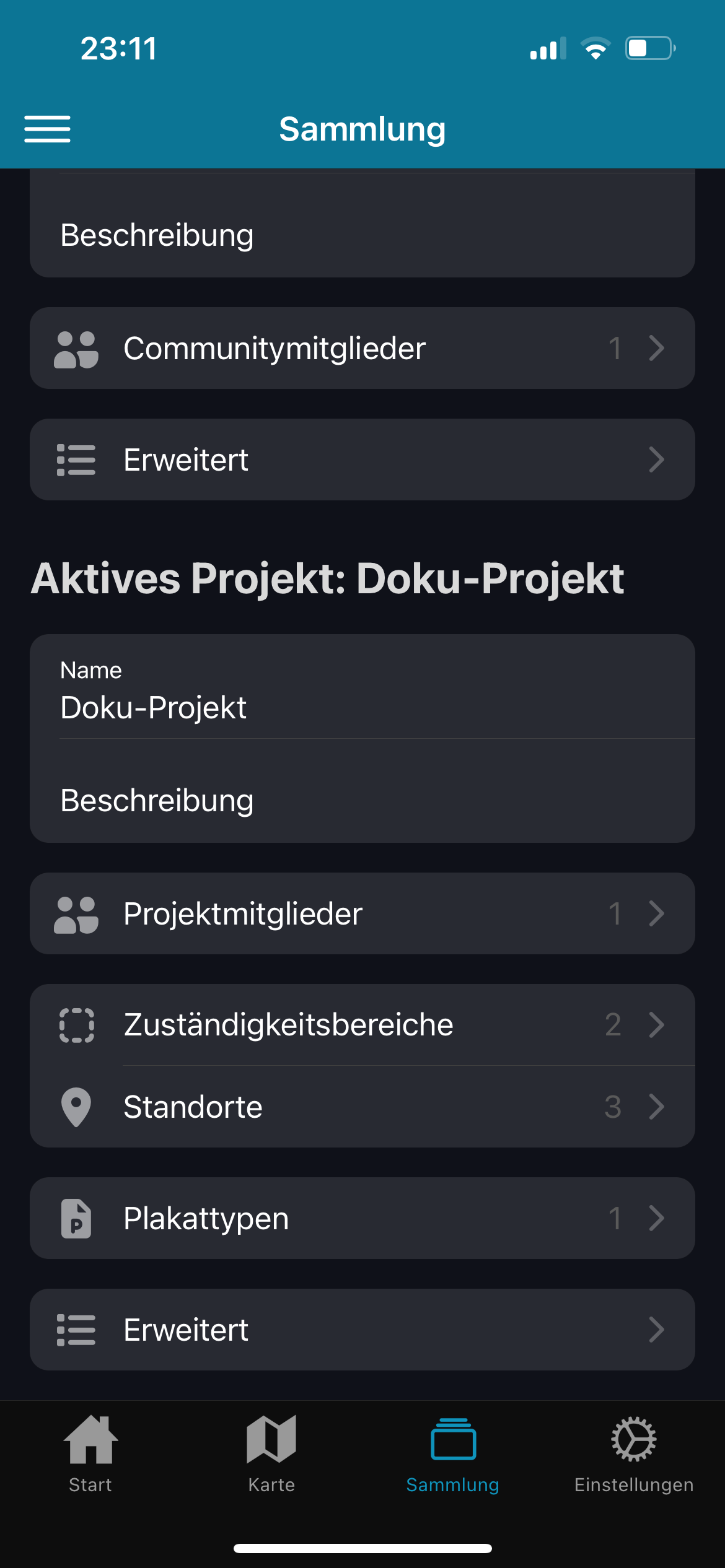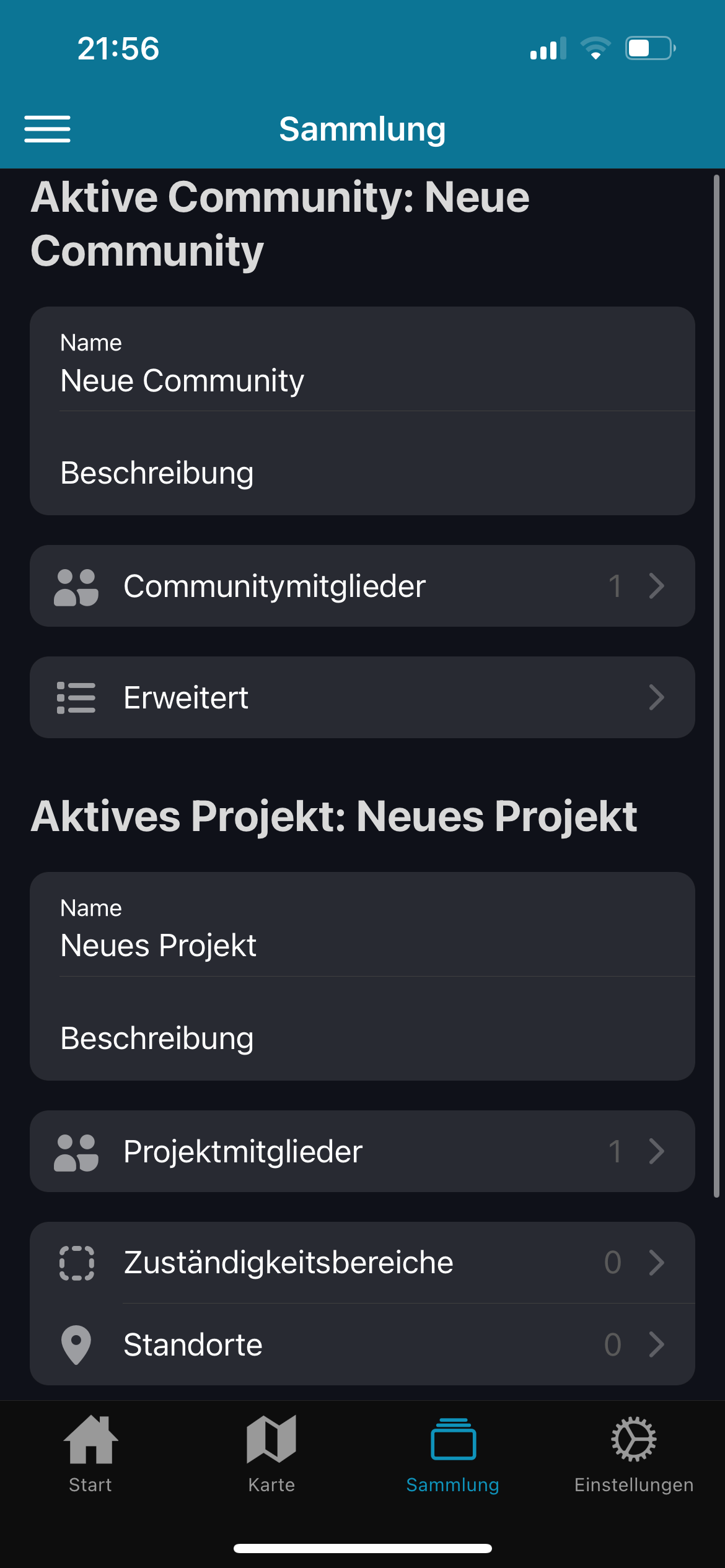 Der Tab Sammlung ist wie ein Karteikartenkasten - er enthält alle Informationen über die aktuell ausgewählte Community und das ausgewählte Projekt.