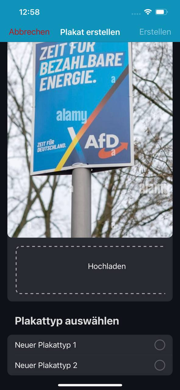 Durch Tippen auf das Kamerasymbol kann ein Foto von einem Plakat aufgenommen und ein neuer Plakatstandort angelegt werden. Mehr dazu in TODO